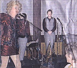 und Peter Angele, hatten mit ihrer Kü-chenbrigade für ein Schlemmerbuffet gesorgt. Zur musikalischen Unterhaltung und flotter Tanzmusik spielten die "Original Kaltenbrunner" auf. Nach dem Essen bestand in den Programmpausen Gelegenheit, das Tanzbein zu schwingen. Vergnügliche Unterhaltung boten "Der große Kowa" alias Michael Gebhardt und "Olga Orange", der Travestiekünstler Thomas Rau. Zauberei Kowa verblüffte mit jedem seiner Tricks, ganz gleich, ob er sich mit Euroscheinen oder Karten beschäftigte, zudem erheiterte er mit seiner Wortgewandtheit. Aus nächster Nähe konnte in einem zweiten Teil die Zauberei begutachtet werden: Kowa ging von Tisch zu Tisch und zauberte hautnah. Um kein Wort verlegen war "Olga Orange". So manches Männer-und sicherlich auch Frauenauge war ob der langen Beine unterhalb des kurzen Minirocks begeistert. Noch mehr Begeisterung rief ihr Mundwerk hervor. Der Travestiekünstler zog mit leichter Hand, auch mal unter die Gürtellinie fas-send, sich selbst und andere durch den Kakao. Der Saal kochte bereits nach wenigen Minuten ob dieses Entertainments. Ohne eine Zugabe durfte "Olga Orange" nicht den Ball verlassen. Den nächsten Glanzpunkt des Balls gab es zu mitternächtlicher Stunde: eine Sektpyramide mit 120 Gläsern, gefüllt in einer Show mit Musik. | ||